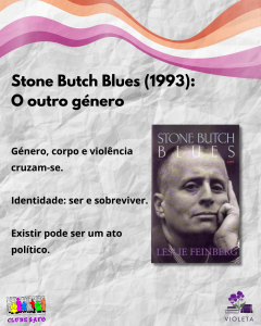 Para Jess Goldberg, a protagonista do romance Stone Butch Blues, a sua identidade é sobrevivência e resistência contra uma sociedade que insiste em categorizá-la de forma binária e irredutível. Desde a infância que Jess é questionada quanto ao seu género, o que a fez crescer com vergonha, com a sensação de que haveria algo de errado, mas que não consegue nomear. Esta barreira dissolve-se quando, em bares lésbicos, encontra pessoas semelhantes a si: mulheres fortes e corpulentas em fatos e gravatas. Conhece Butch Al, que se torna sua mentora e lhe ensina códigos de vestuário e comportamento, em especial para sobreviver à brutalidade policial. Jess descobre-se e identifica-se como uma “stone butch”, uma identidade definida pela prática sexual de dar prazer à parceira, sem permitir ser tocada reciprocamente. Devido à violência extrema e à marginalização, Jess toma a decisão estratégica de tomar hormonas e uma mastectomia, passando a ser lida socialmente como homem. Porém, há um custo: embora essa passabilidade lhe conceda segurança, Jess sente-se como um “fantasma” ou alguém “enterrado vivo”, e sofre com o apagamento da sua história e o seu passado como mulher. Eventualmente, decide parar as hormonas e viver num espaço de transitividade de género. Conclui que não se sente nem como um homem, nem como uma mulher convencional, mas como algo “outro”, uma fora-da-lei do género, e lésbica. Esta atitude, de aceitação e reclamação da sua história e identidade, Jess transforma o estigma em força anímica para viver de forma autêntica, independente dos rótulos do mundo exterior. Stone Butch Blues é uma obra incontornável, uma ode à masculinidade enquanto processo de cisão, intencional e ativa, da ideologia dominante; uma masculinidade reciclada, alternativa e independente do homem.