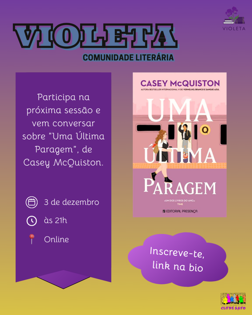 3-dezembro-2025, 21h00 – 23h Online A propósito do Dia da Luta Mundial contra a SIDA, a Violeta convida-te para a última sessão do ano, dedicada a Uma Última Paragem, de Casey McQuiston. Esta é uma história vibrante que cruza amor romântico, memória e a família que podemos encontrar e escolher na comunidade. As inscrições já […]